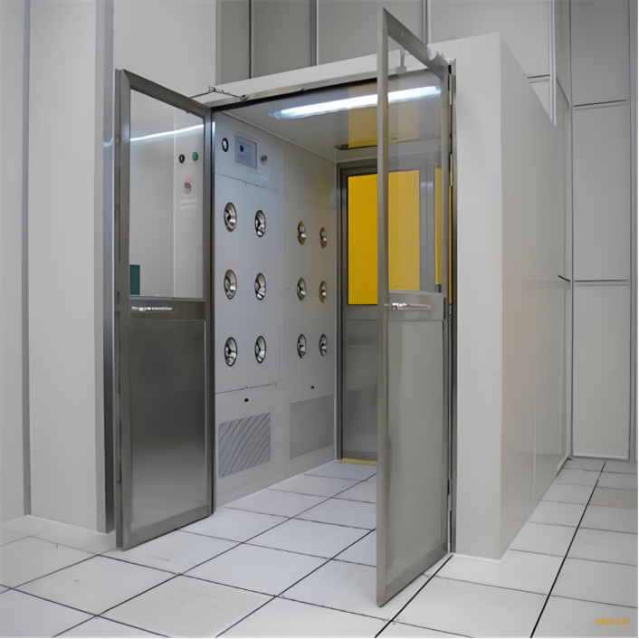 在電子車間,風淋室的作用也是比較關鍵。芯片制造對環境潔凈度要求極高,哪怕是微米級的塵埃附著在晶圓表面,都可能導致電路短路、良率下降。風淋室作為潔凈第一道關卡,通過嚴格清除操作人員衣物上的纖維、毛發等雜質,將車間潔凈度維持在 ISO 5 級(百級)以上,為芯片封裝、半導體焊接等精密工序提供穩定的潔凈環境。